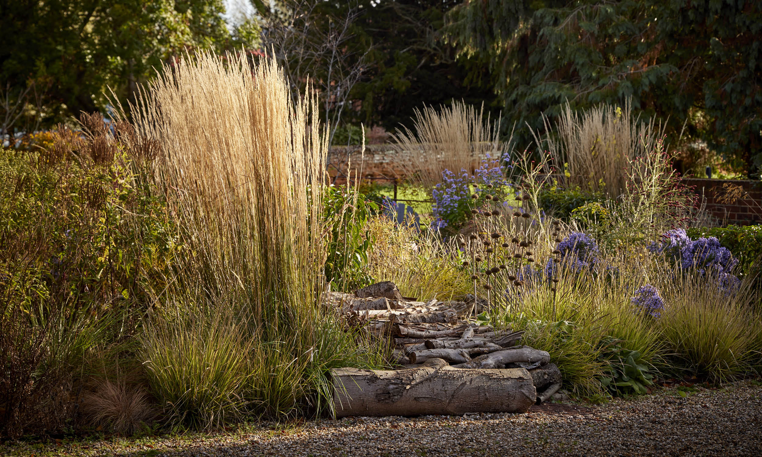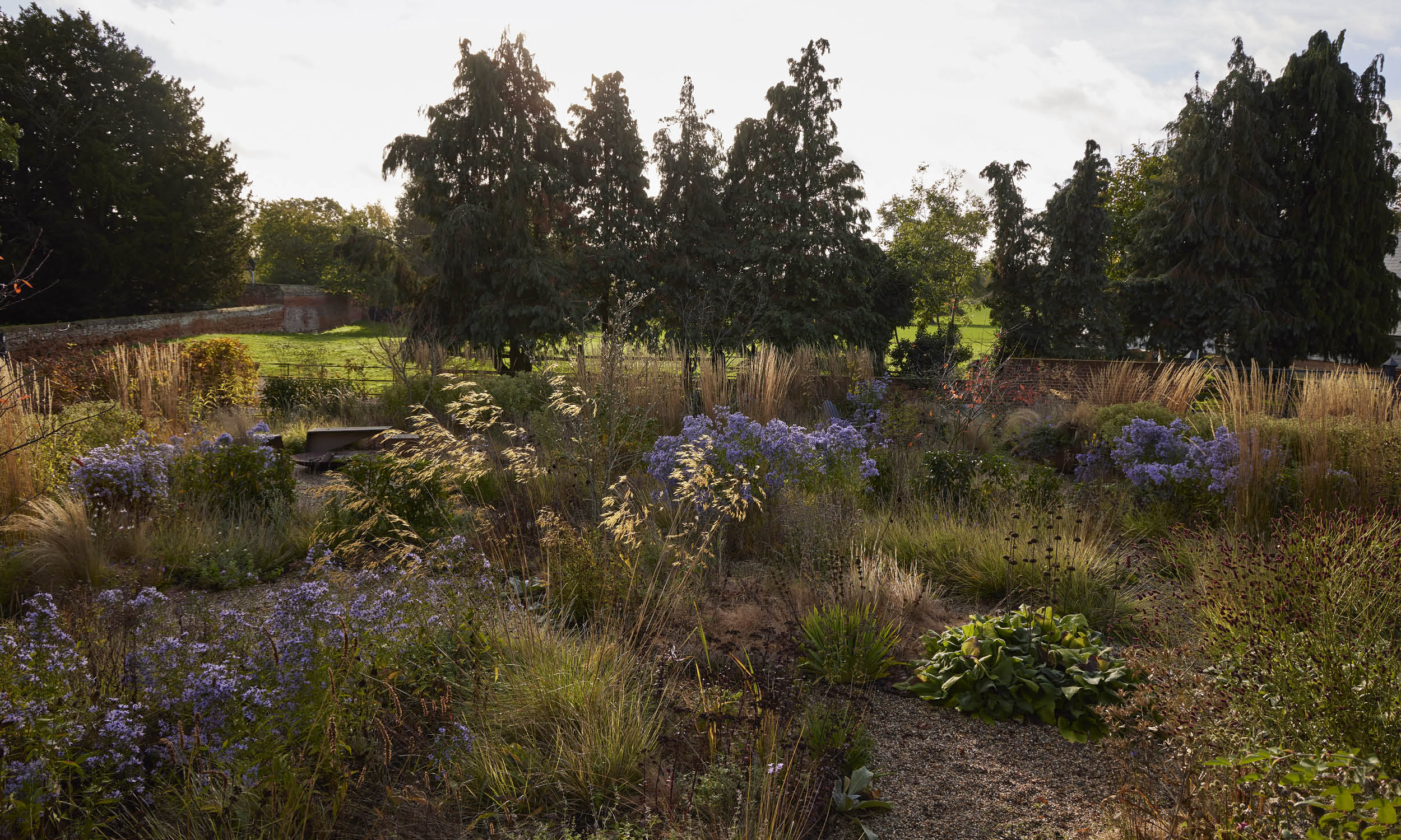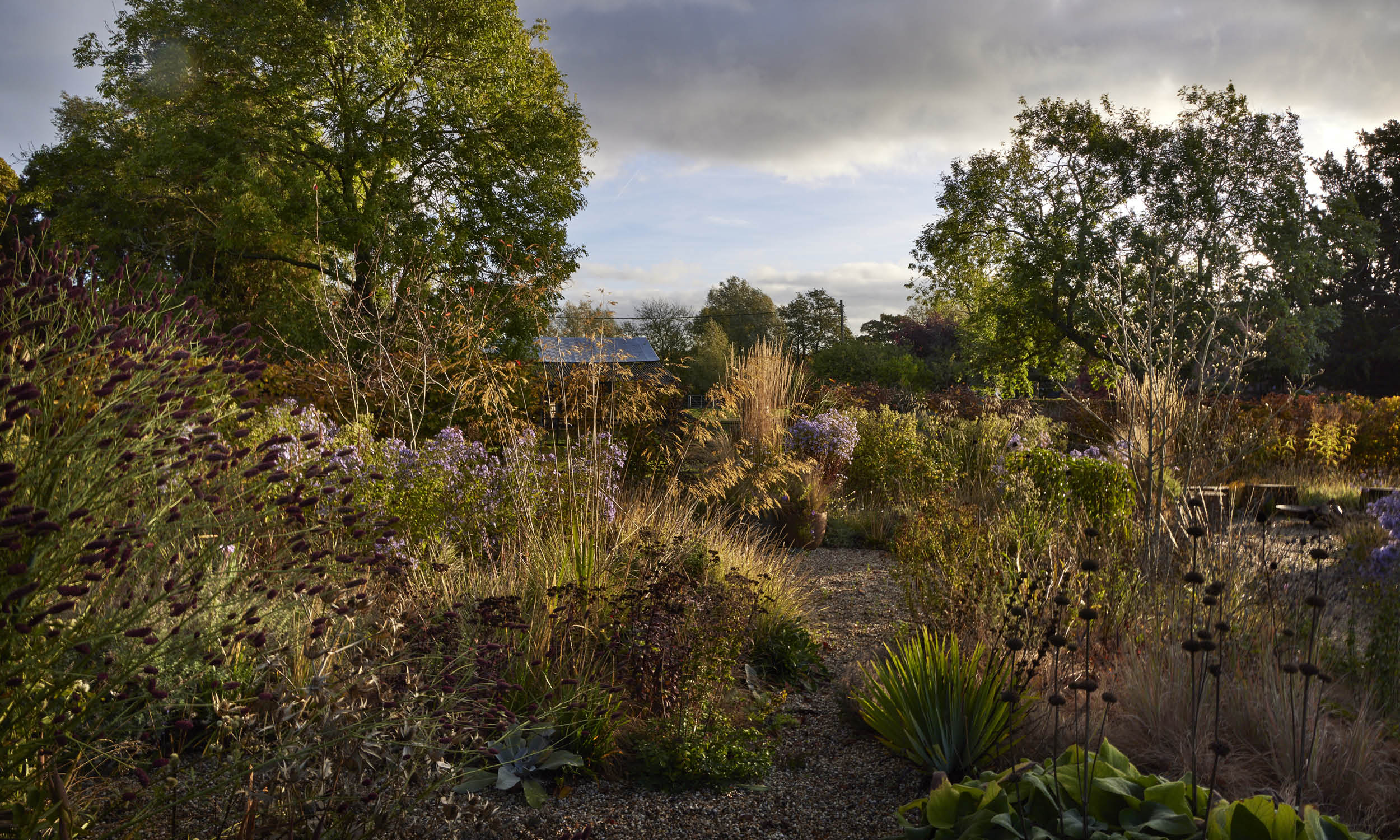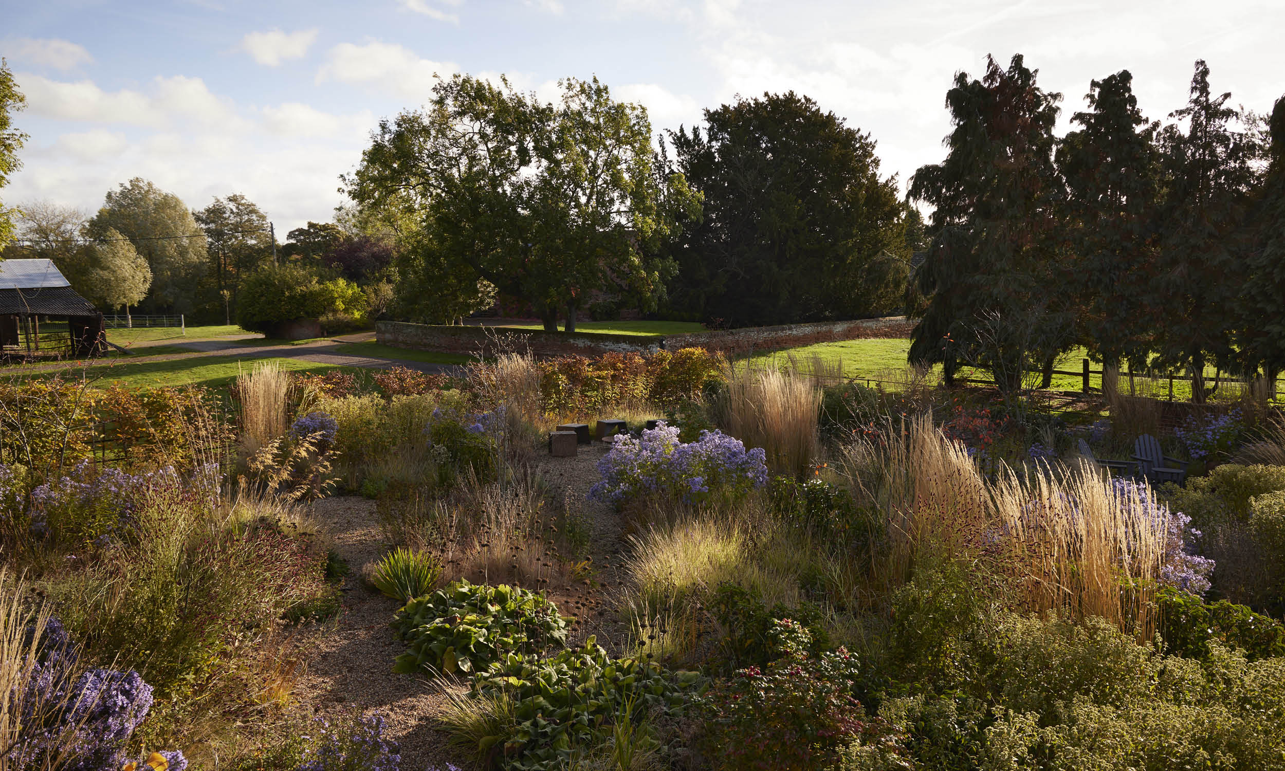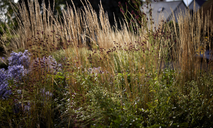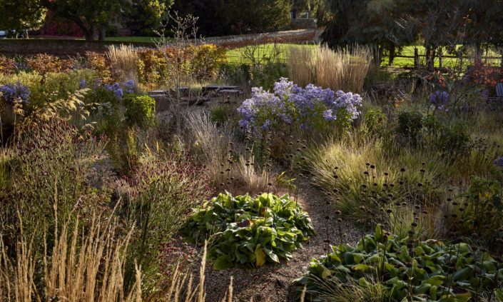 We have replaced the lawn with a substantial area of perennial planting that is guaranteed to attract birds, butterflies and beneficial insects. Two grasses – Sesleria autumnalis and Sporobolus heterolepis – dominate, unifying the design and creating the matrix into which we have blended sheets of bulbs and over a thousand perennials, ensuring interest from end to end of the year.