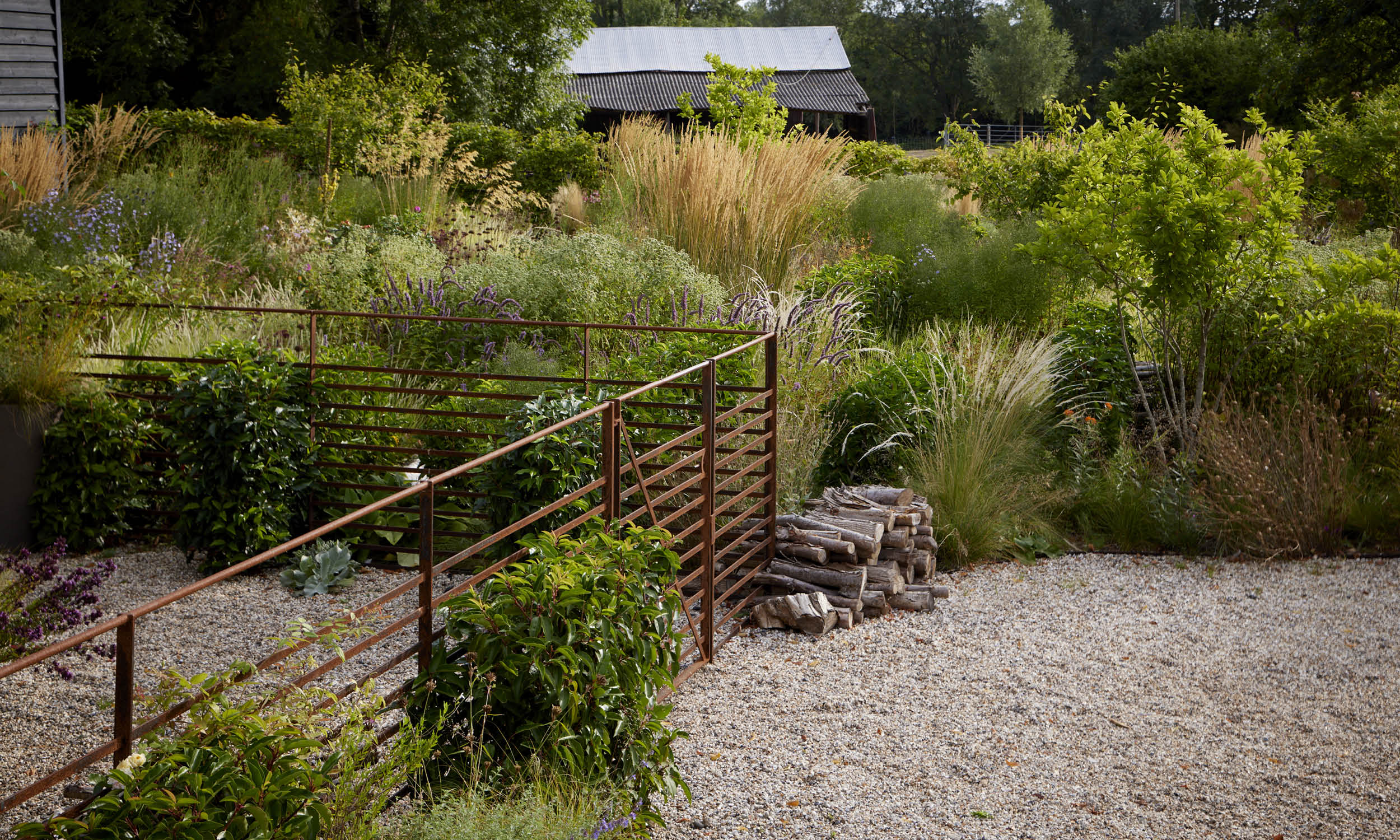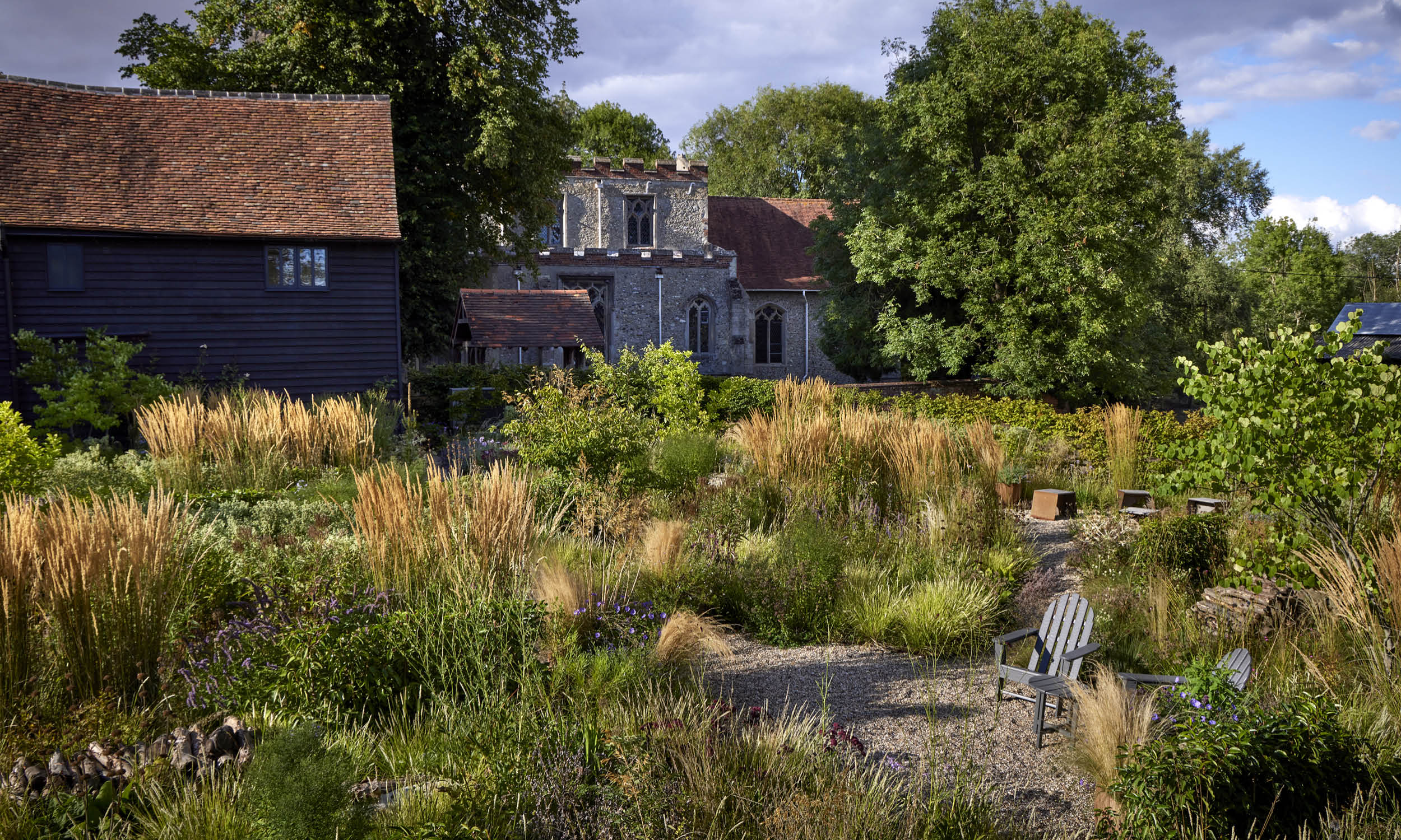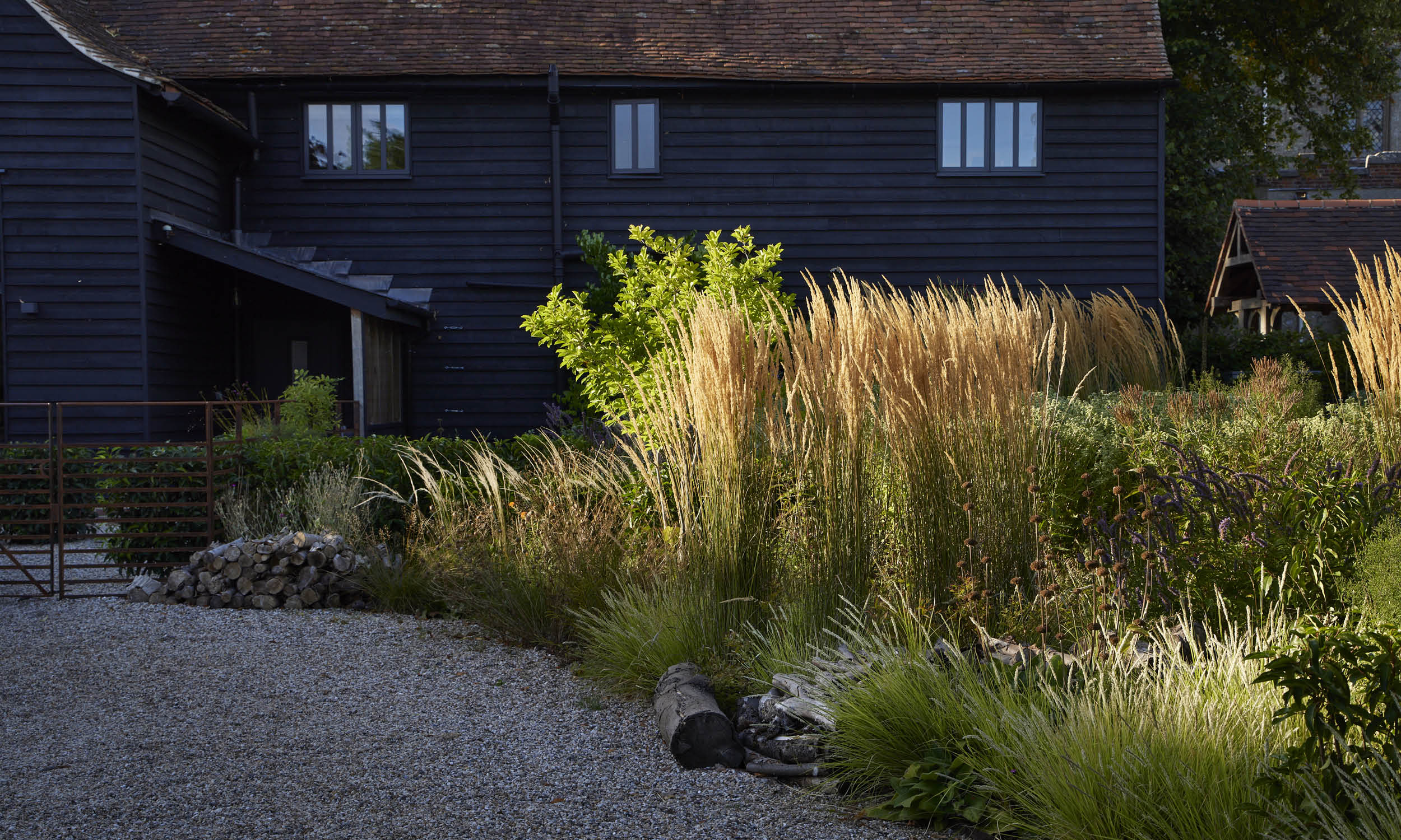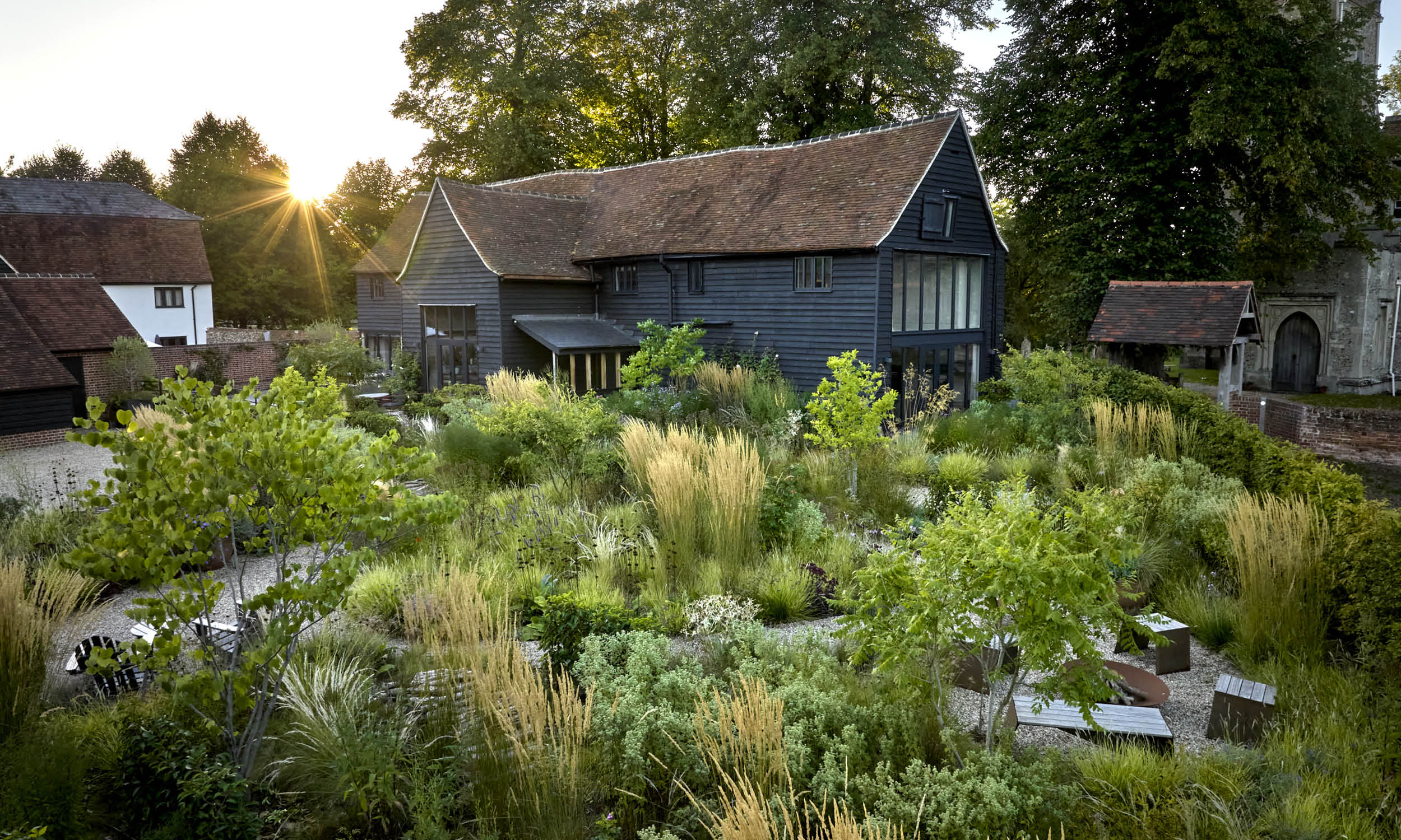 Meandering gravel paths lead to three distinct zones: a sunbathing area, a fire pit space, and a sunny corner ideal for morning coffee. Climbing roses—‘Claire Austin’, ‘Mortimer Sackler’ and ‘The Generous Gardener’—adorn the barn and remaining walls.