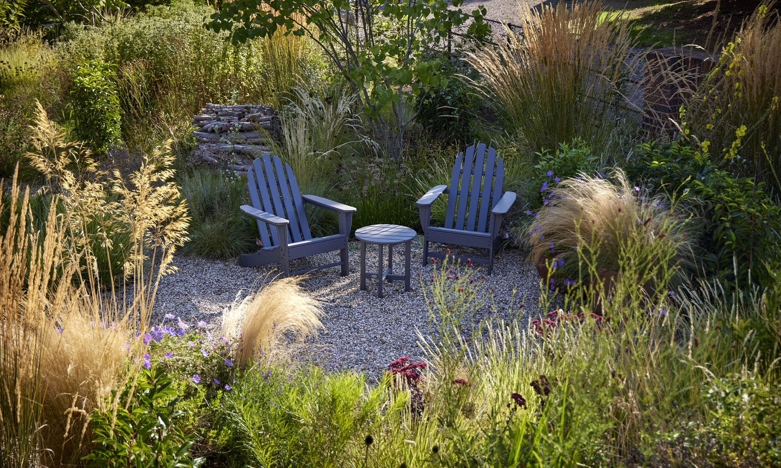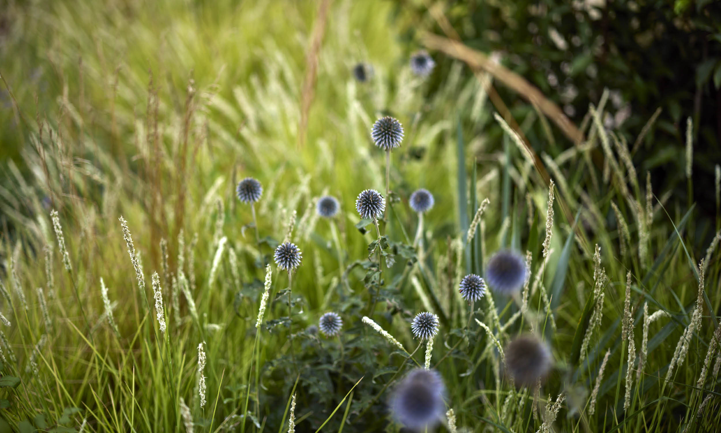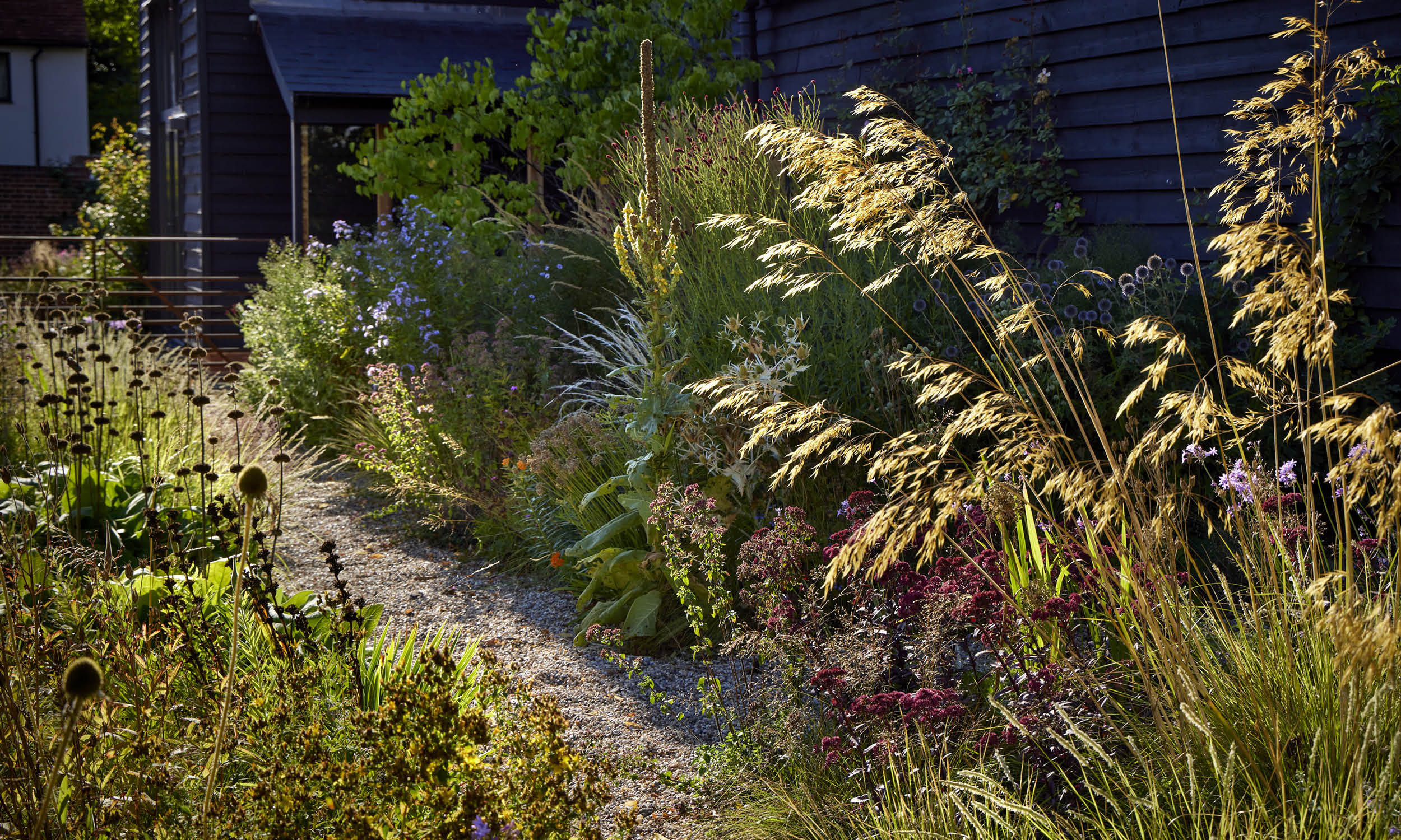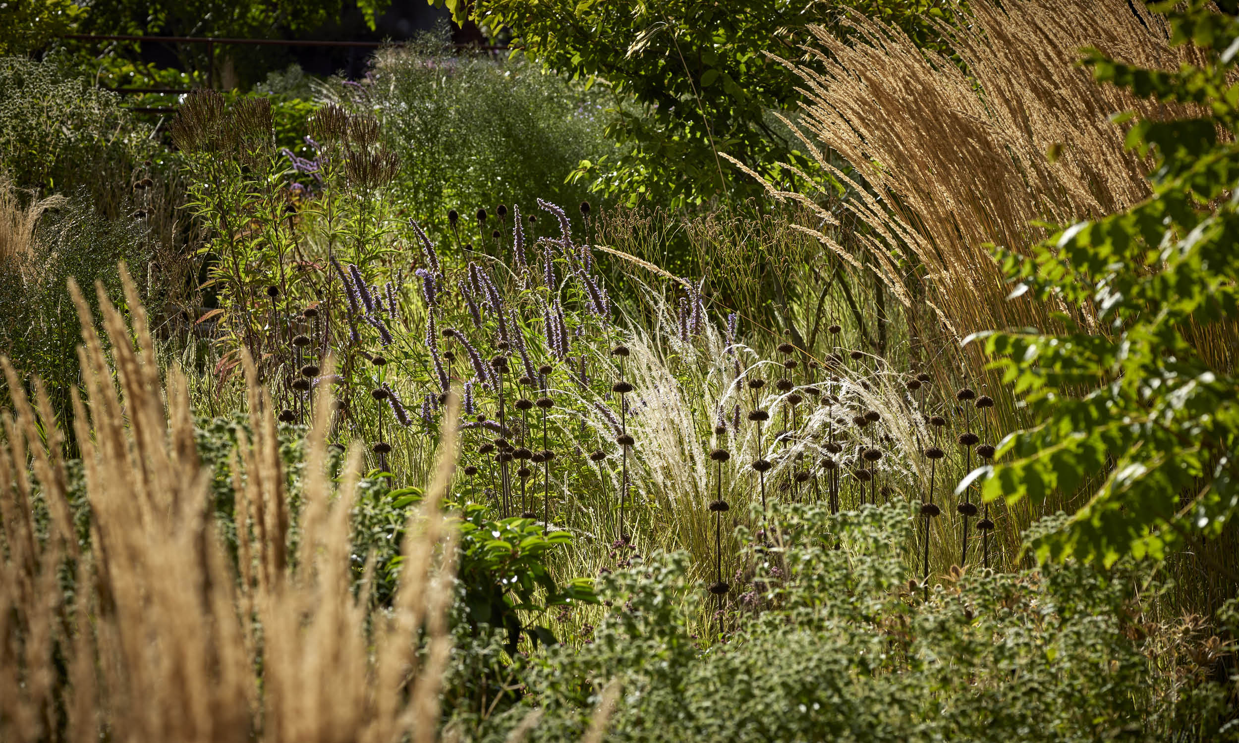 In summer, the garden reaches its peak with swaying grasses like Stipa ichu and Calamagrostis acutiflora ‘Karl Foerster’, complemented by perennials such as Sedum ‘José Aubergine’, Agastache ‘Blue Fortune’ and *Sanguisorba canadensis’.