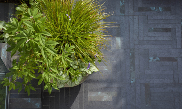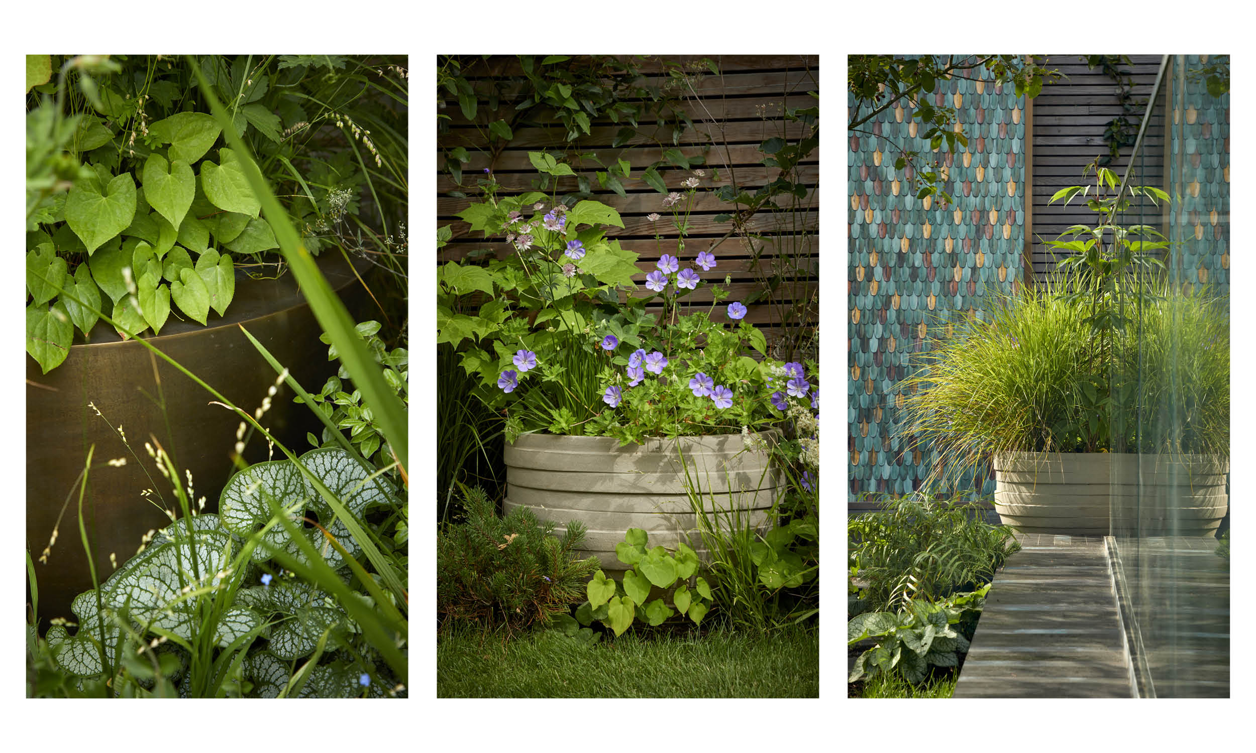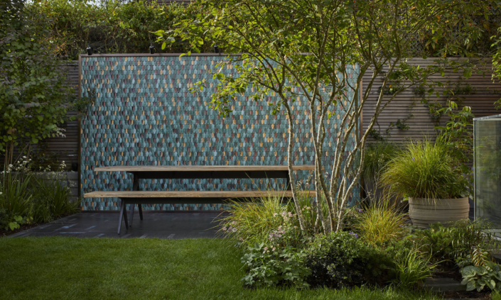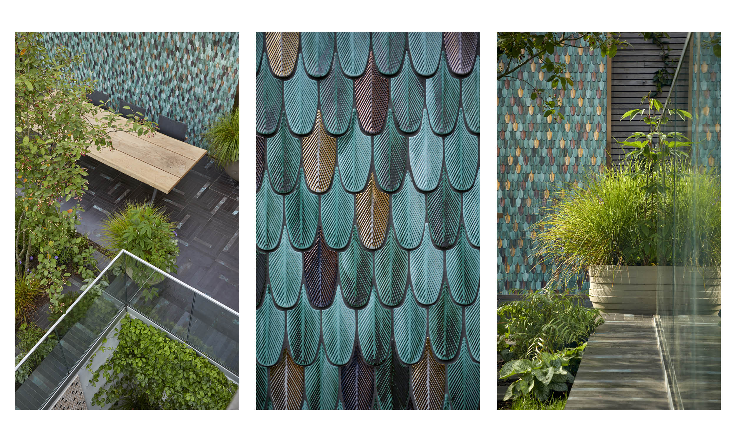 The tiles’ subtle colours and textures were the inspiration for Stefano’s planting plan, so that in spring the new leaves of Cercidiphyllum japonicum – the Katsura tree – match their subtle pinks, the bronze tiles are echoed by Anemanthele lessoniana, an ornamental grass, and the deeply veined surfaces of Rubus lineatus leaves seem to reflect the tiles’ incised pattern.