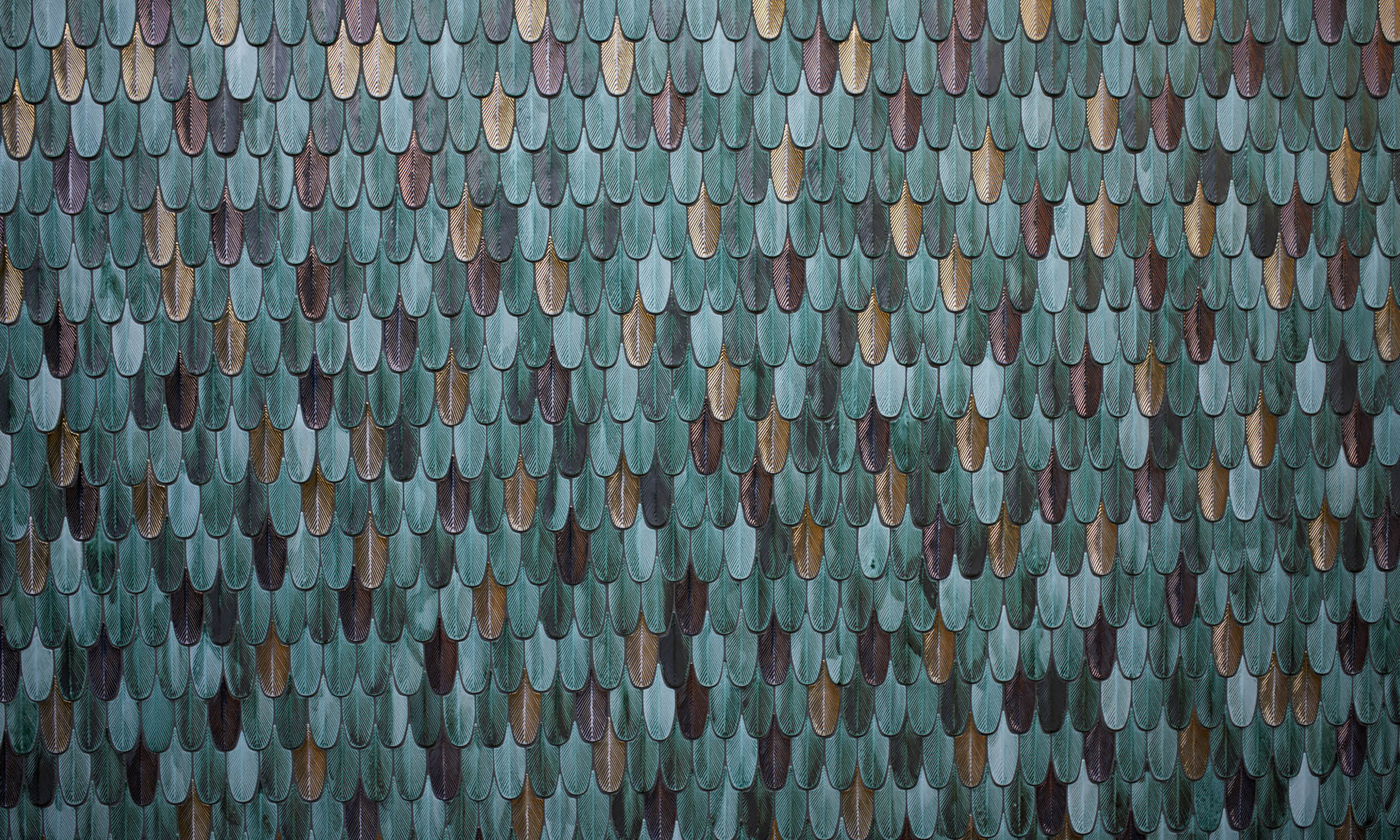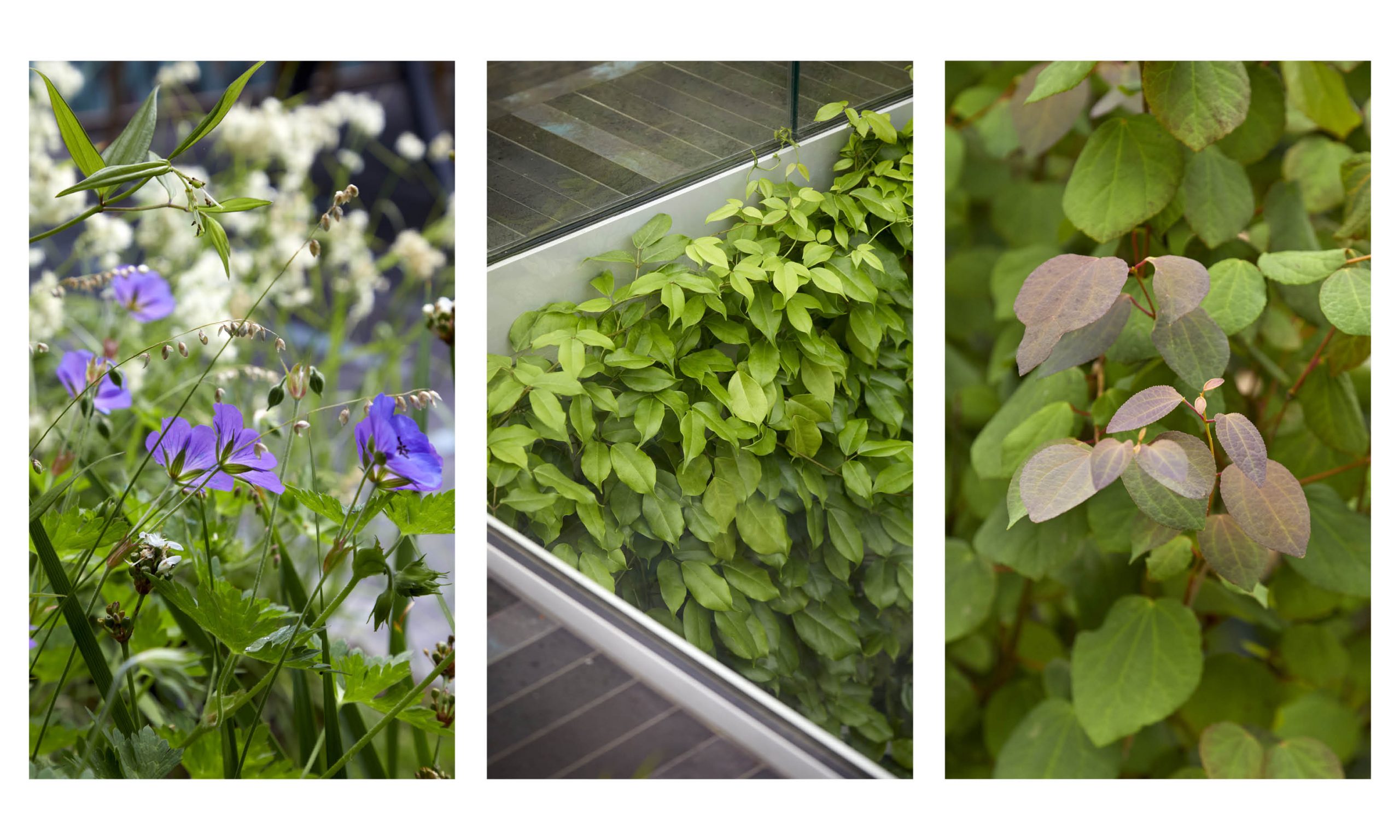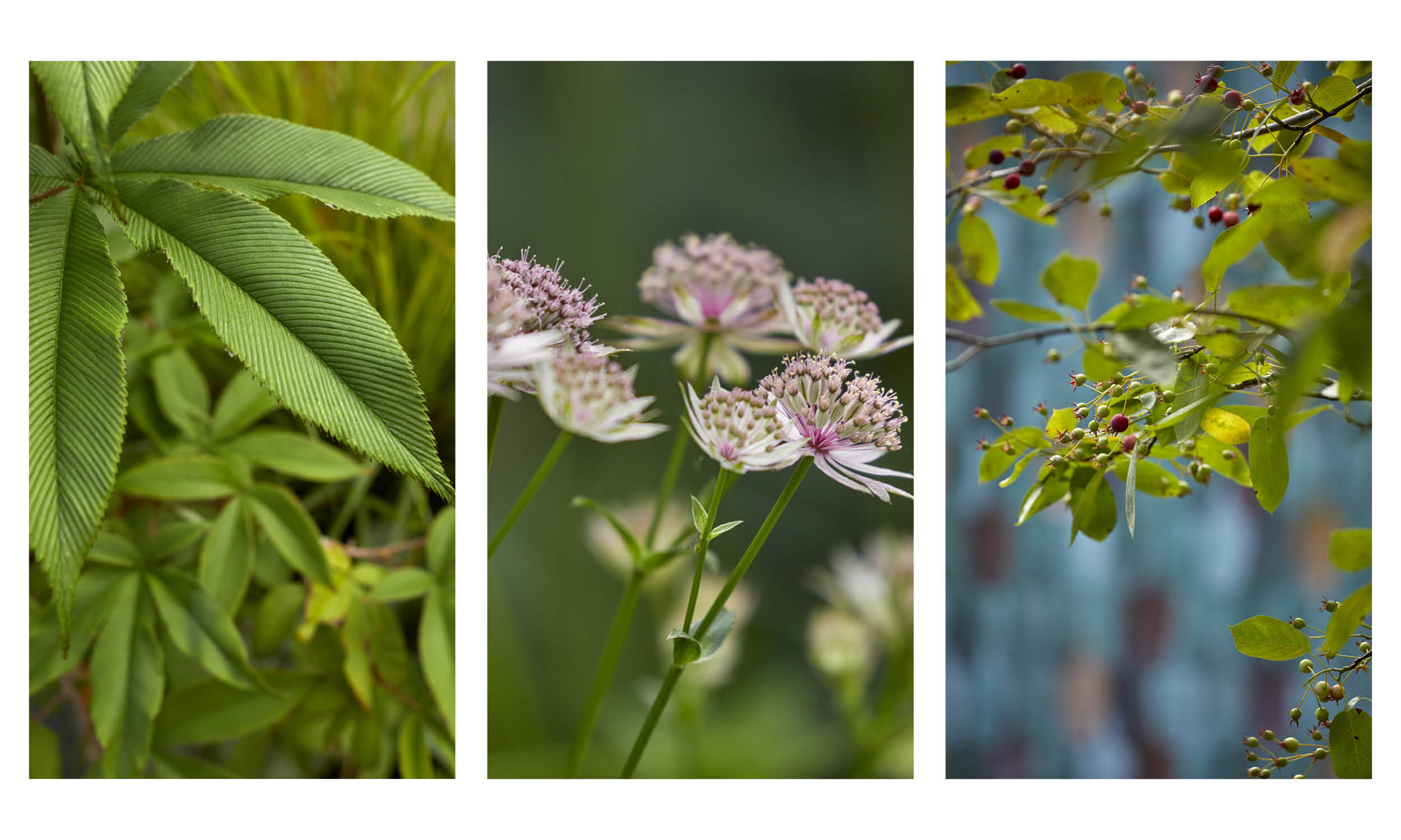 The tiles’ subtle colours and textures were the inspiration for Stefano’s planting plan, so that in spring the new leaves of Cercidiphyllum japonicum – the Katsura tree – match their subtle pinks, the bronze tiles are echoed by Anemanthele lessoniana, an ornamental grass, and the deeply veined surfaces of Rubus lineatus leaves seem to reflect the tiles’ incised pattern.