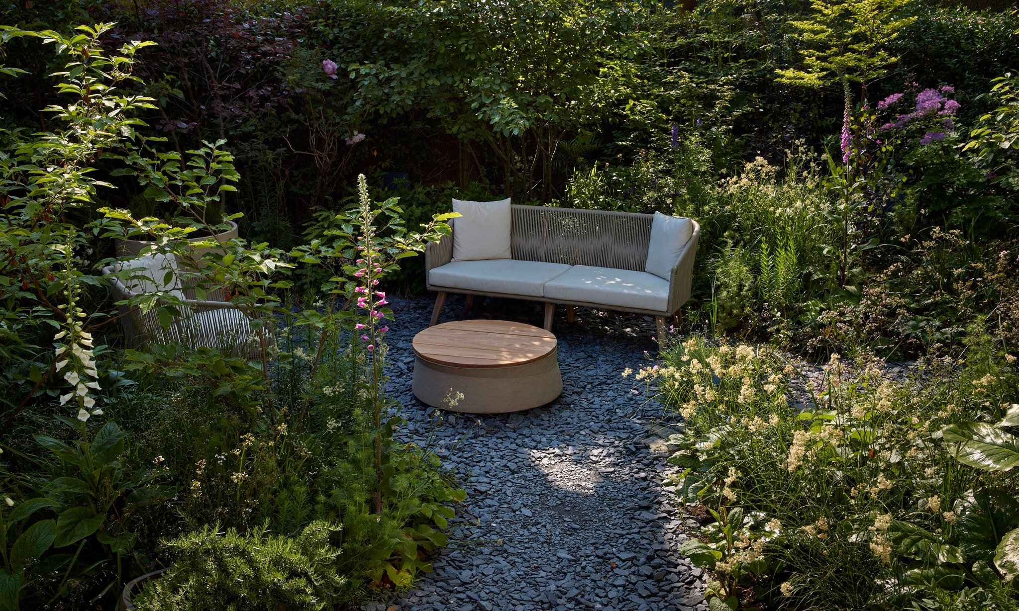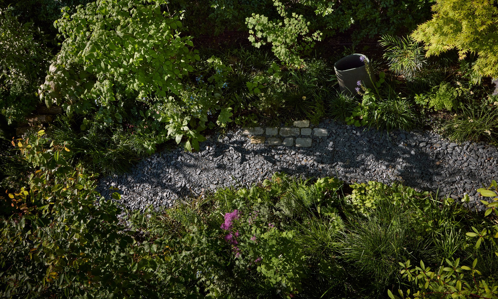 The garden is designed as a walk-through woodland, where intriguing plants, hidden corners, playful features, and sculptural elements invite exploration and relaxation.